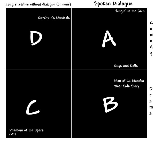 I like Type A musicals - where the dance is incorporated naturally into the songs, the dancing is amusing and not necessarily spectacular, and there are plenty of jokes to keep the show flowing. I enjoy Singin' in the Rain, for example, and I miss true musical comedies, which have been extinct forever. I usually like Type B musicals if they are good ones, like West Side Story and Man of La Mancha, with a solid story and good tunes. I don't much care for Type D - alleged comedies where the comedy is actually just a lame excuse for production numbers. Don't get me wrong about Gershwin, whose musicals are listed here on the chart. I love his melodies. I sing them in the shower. He may be my favorite 20th century composer, but his musicals are just glorified Busby Berkley productions. The comedy is lame, and the musical numbers go on and on and on, long after I've lost interest in them. I usually find myself looking in the Playbill to see when the next good song is coming. |