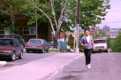 In addition to such breaches of logic, there are big, obvious, confusing continuity errors that Ed Wood could have spotted. At one point, Eric Roberts goes for his morning run. As he leaves the house it is Winter and all the trees are barren. When we see him a little later, he's running through a tree-lined street, and the leaves have mysteriously returned to all the deciduous trees. (See below.) He is a Phys Ed teacher, so I guess he was in good enough shape to run from Quebec to South Carolina.