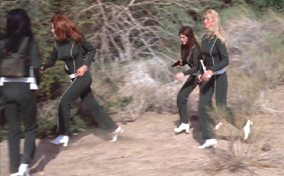 An evil ex-CIA agent is about to take over the world. To demonstrate his unchallengeable power, he is exploding America's space missions with impunity. On a secret island off the coast of Venezuela, he and his private army, without any fear from the CIA or the U.S. Army, are prepared to unleash biological warfare upon the world - millions of rats infected with bubonic plague. Who can stop them if the might of America's military is insufficient? Well, basically the only hope for the world is six chicks clad in polyester suits and white vinyl high-heeled go-go boots, under the leadership of their commander, Sabrina. These boots are made for desert-walkin' (see picture) Can you guess which decade this comes from? One more hint: the evil bad guy wears Quiana shirts with several open buttons, and gold chains. Oh, yeah, and he owns every BeeGee's album and one of those mirror balls. |