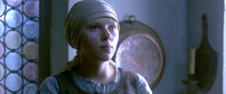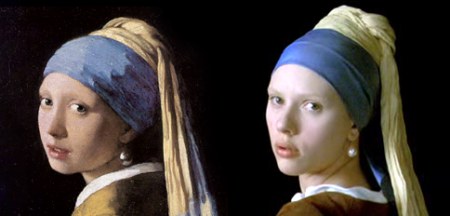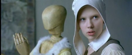 Directly above these paragraphs is a side-by-side juxtaposition of Vermeer's Girl with a Pearl Earring (1665) and Johansson posing for that painting in the film. The screenplay suggests that the same girl was the model for both paintings, but there is no evidence to support that supposition, and there is the contradictory evidence that Vermeer called one a woman and one a girl. I'm sure the writers were aware that the case for this was weak, but it does make for a pretty good story. |