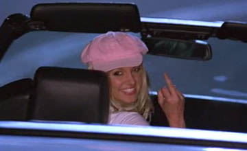 The puppet plot was mostly crap so the film drags when Jennifer isn't around, but she carries her portion of the film with her offbeat charisma and her self-effacing humor, so I think the film was worthwhile just to see her scenes. In this case, I side with the genre sites (who loved it) rather than the mainstream reviewers (who panned it) . It is only rated 4.5 at IMDb, but I think it is a decent comedy and should be rated higher. There is one non-Tilly scene to remember: Chucky is driving on a winding hillside road when he is cut off by Britney Spears, who turns around and flips him the bird (pictured to the right). Big mistake. It's not wise to incite road rage in a criminally murderous puppet! Chucky incinerates her and says, "Oops! I did it again." By the way, the credits specifically say "Britney Spears did not appear in this film" |