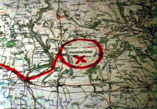 • The most entertaining detail I noticed was the location pf Peenemuende on a map. The director managed to locate it in the wrong place by taking a real map of someplace or another (is it even in Germany?) and inserting Peenemuende in a random spot by using some cheap white-out then typing over the map with a completely different style of font (see the picture to the left, which is an actual capture from the film.) This link shows the real location of Peenemuende. As you probably can determine if you understand German, it is located at the mouth of the Peene River, which flows into the Baltic sea. The creators of Shining Through made absolutely no attempt to do even the tiniest bit of research on the subject.